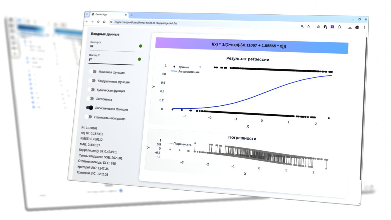 – И показываем более сложное приложение для аппроксимации данных разными кривыми, которое берет переменные из окружения Engee.