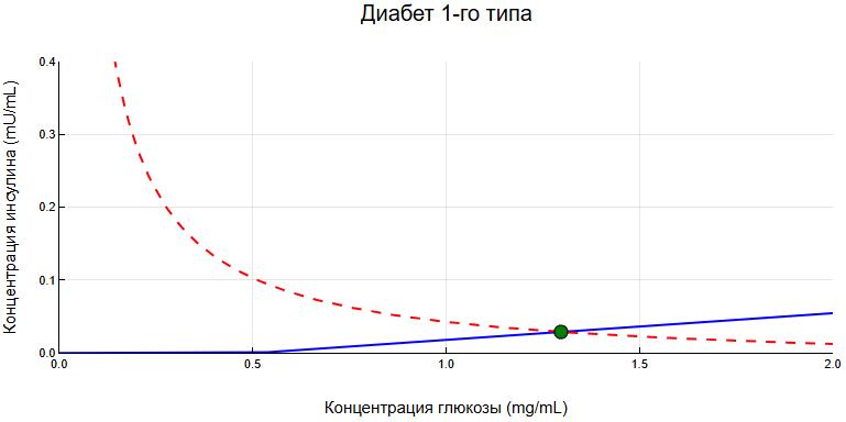 Система описывается дифференциальными уравнениями, связывающими уровни глюкозы и инсулина: повышение глюкозы стимулирует секрецию инсулина, который, в свою очередь, ускоряет утилизацию глюкозы и возвращает систему в равновесие.